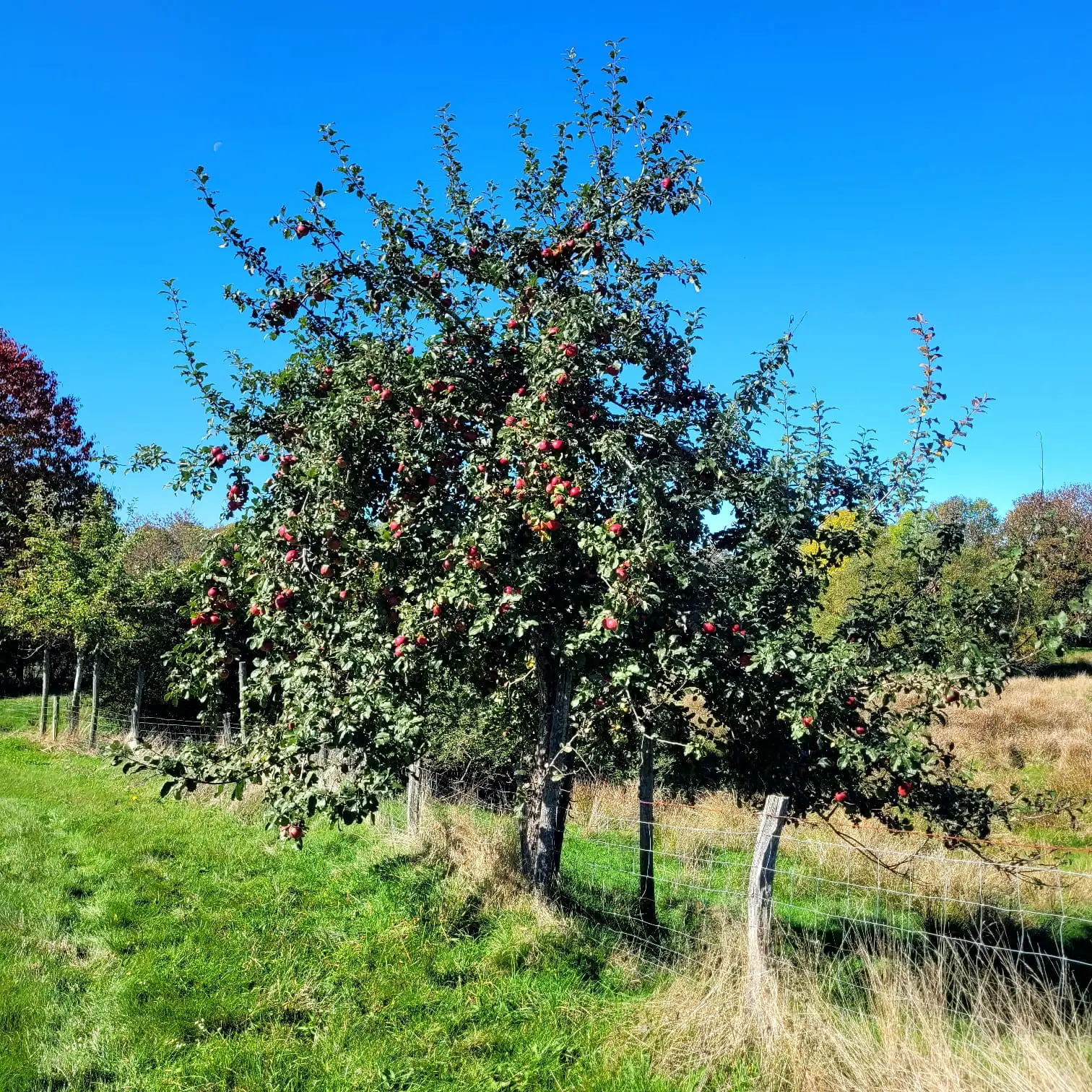 Un arbre haute tige bien chargé, malgré une année sèche et de l’herbe au pied qui n’est plus un problème a cet age.