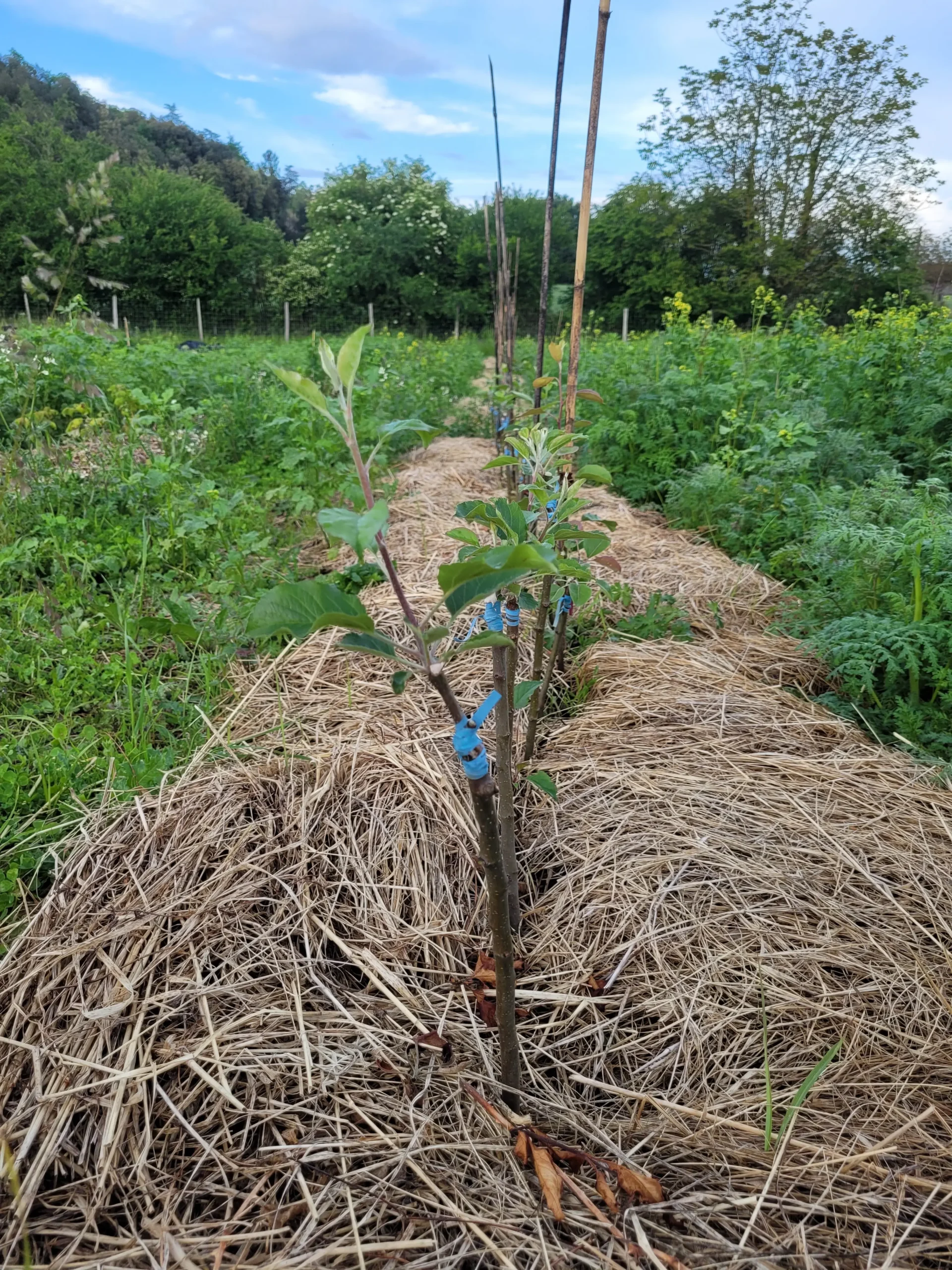 Ma première année de test en pépinière, des plants bien paillés sur un terrain exempt de rat taupier.