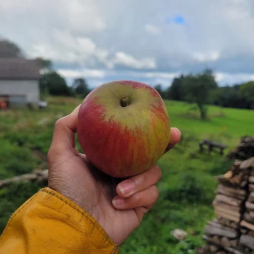 Pink Pearl à la chair rose, Red Love à la chair rouge, Pomme Banane aux arômes surprenants, Reinette Étoilée à la peau ponctuée… Je les cultive parce qu'elles méritent de ne pas disparaître — et parce qu'elles ouvrent toujours la conversation.