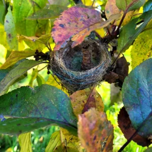 Nid d’oiseau dans un pommier, avec malheureusement de la ficelle agricole. Ramasser les déchets un enjeu pour la sauvegarde du vivant !
