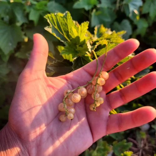 Variété ancienne, le groseillier Versaillaise Blanche produit de longues grappes de baies blanches translucides, juteuses et légèrement acidulées.